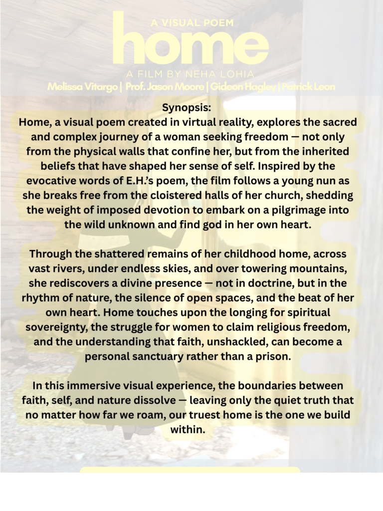 Synopsis: Home, a visual poem created in virtual reality, explores the sacred and complex journey of a woman seeking freedom — not only from the physical walls that confine her, but from the inherited beliefs that have shaped her sense of self. Inspired by the evocative words of E.H.’s poem, the film follows a young nun as she breaks free from the cloistered halls of her church, shedding the weight of imposed devotion to embark on a pilgrimage into the wild unknown.