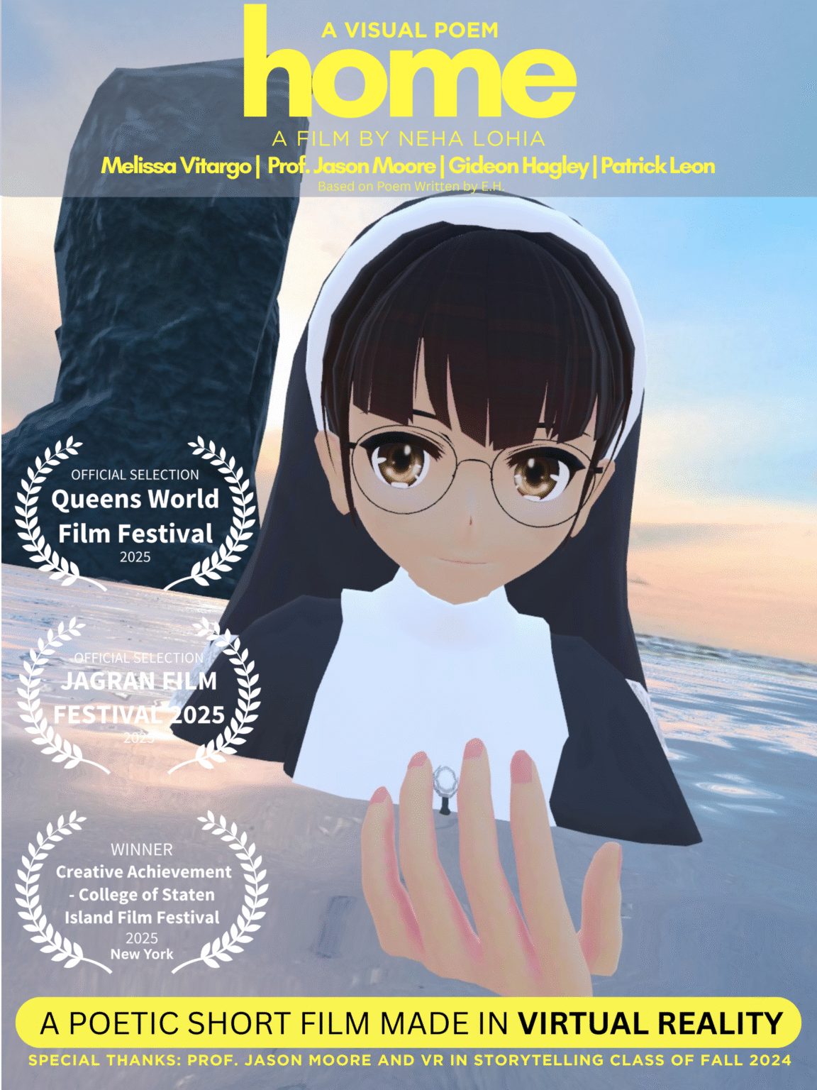 A current (as of March 2026) undergrad film student of CUNY (City University of New York) College of Staten Island and Brooklyn College, she is pursuing VR in Storytelling alongside XR and new tech in cinema production program, Neha merges her background in traditional filmmaking with cutting-edge virtual reality techniques, crafting stories that invite audiences to step inside not only her characters’ worlds, but their inner lives. Her latest VR short film, Home, is a poetic meditation on spiritual freedom, feminine liberation, and the evolving relationship between faith, nature, and self.